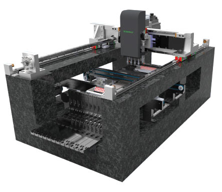 1、貼片機采用花崗巖一體化設計制造的高精密運動平臺技術。同時,一體化的結構還具有抗震能力。