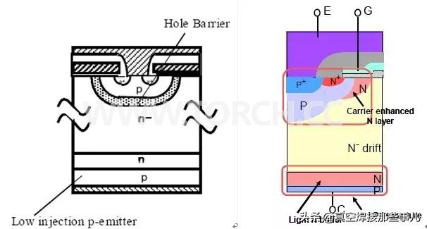 IGBT的集電極區(qū)結(jié)構(gòu)影響著PNP晶體管的增益,對正向壓降與關(guān)斷損耗都有重要的影響。早期的穿通型IGBT其集電極區(qū)結(jié)深較大,空穴注入效率很大,容易發(fā)生閂鎖效應(yīng),必須采用局部壽命控制技術(shù)來控制背部空穴注入效率,但是卻因此面導(dǎo)致了導(dǎo)通壓降的負(fù)溫度系數(shù),不利于并聯(lián)應(yīng)用。后來出現(xiàn)的非穿通型IGBT,采用了透明集電極結(jié)構(gòu),